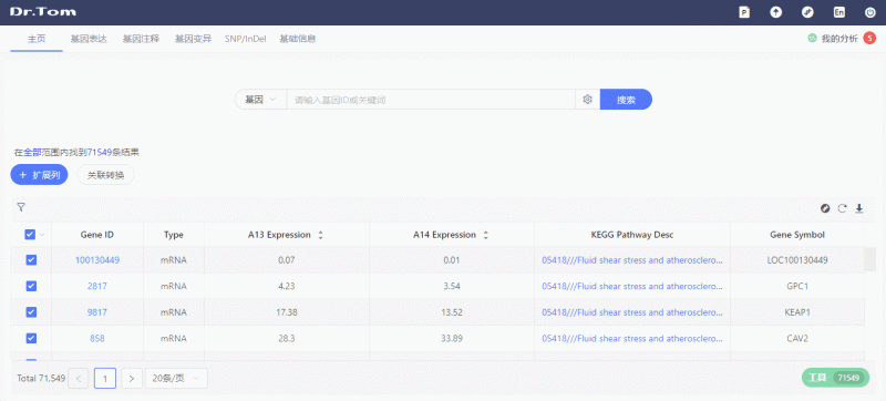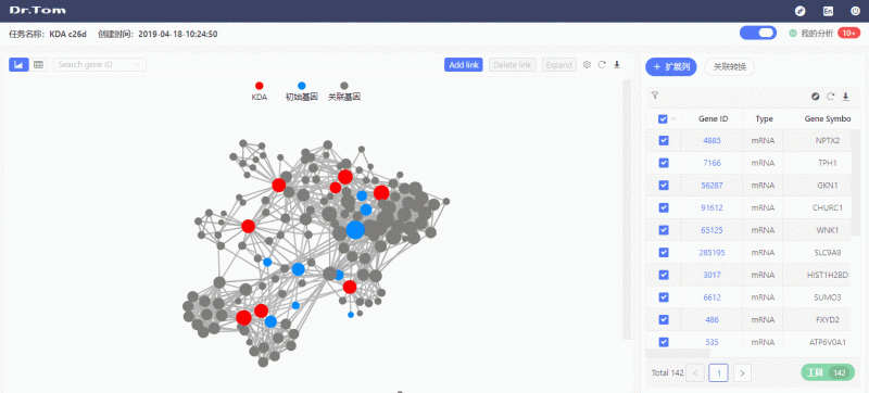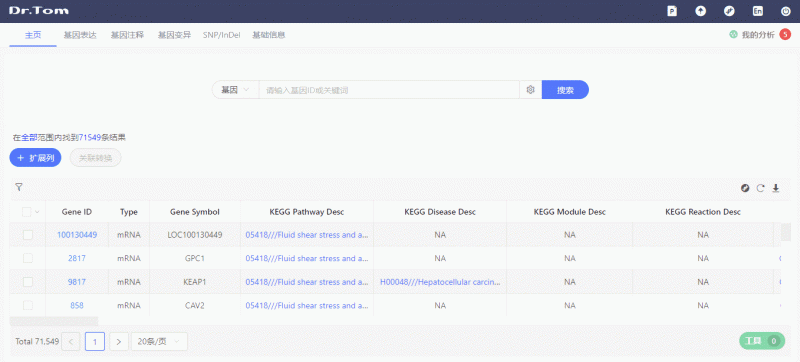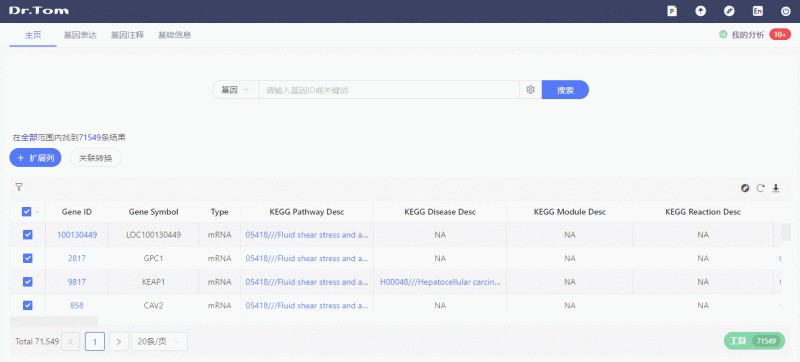 挑选出目的基因,注释和功能是什么?和其他哪些基因有互作?GO、Pathway功能是什么?又有哪些文献支持?在Dr. Tom 2.0中,一键点击即可拉取所有信息。